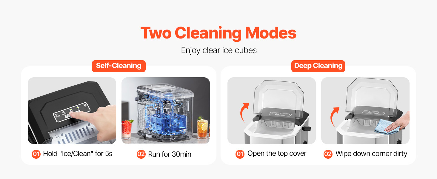 Easy to Control & Self-Cleaning: The control panel is very easy to operate. Simply fill the tabletop ice maker with water, press the ON button, and select the ice cube size. The indicator light will turn on when the water level is low or the ice basket is full. Just press and hold the power button for 5 seconds to activate the 30-minute self-cleaning mode.